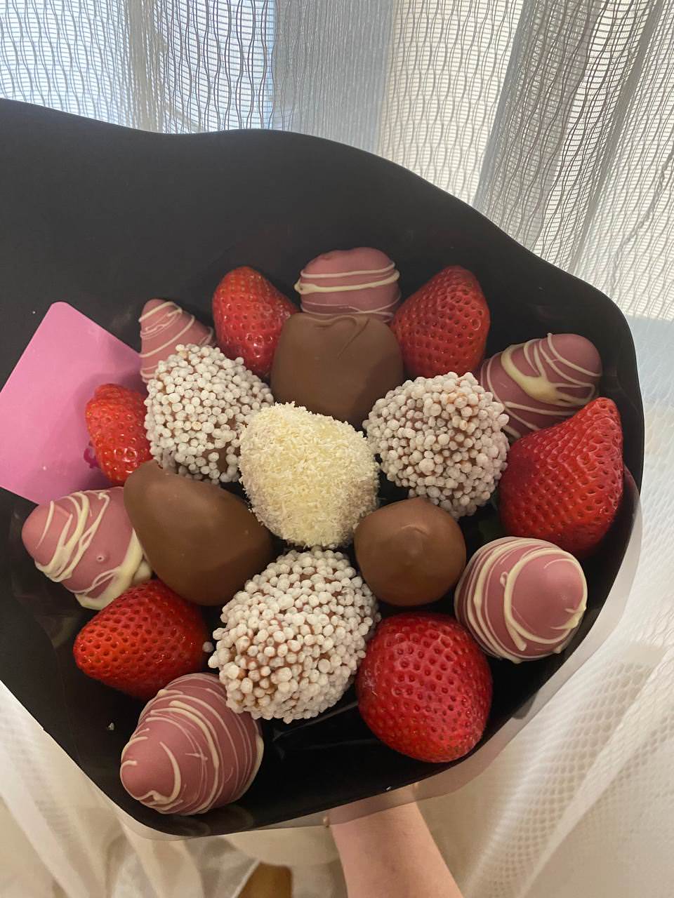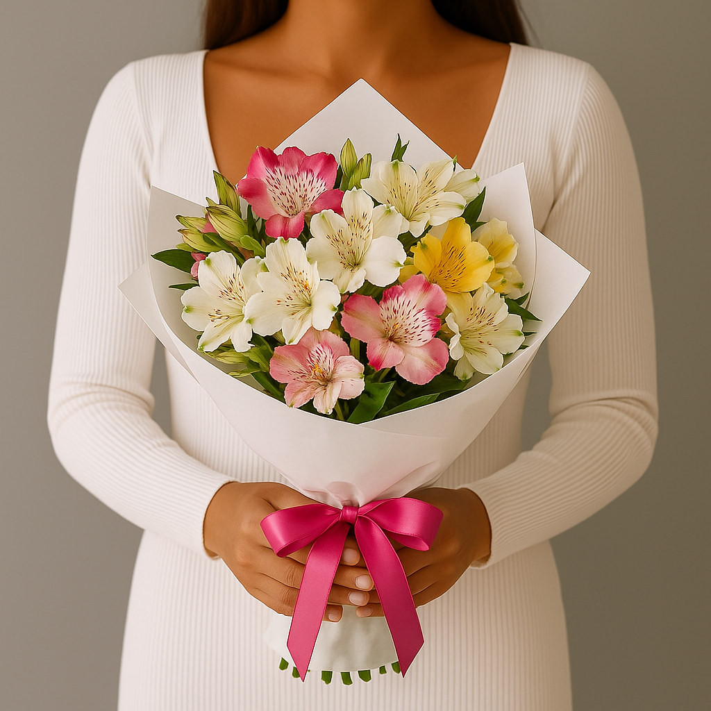 Элегантный букет из альстромерий в белой упаковке, перевязанный яркой розовой лентой. Нежные сочетания белых, розовых и жёлтых цветов создают атмосферу свежести и радости.