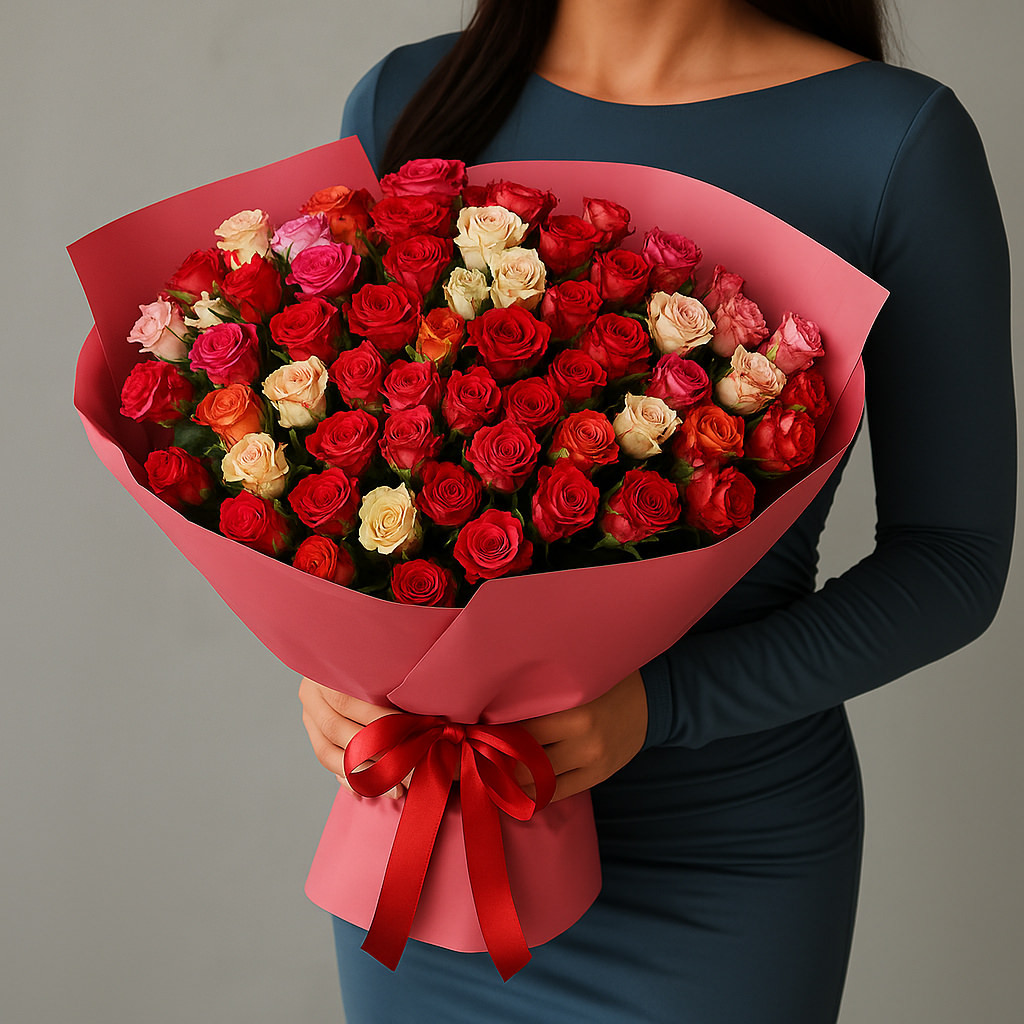 Яркий букет кустовых роз «Феерия чувств» — это гармония нежности и страсти, воплощённая в одном подарке. Микс из алых, кремовых, розовых и малиновых оттенков создаёт роскошную палитру, которая покоряет с первого взгляда. Такой букет станет лучшим выбором для признания в любви, торжества, юбилея или просто, чтобы подарить близким радость и незабываемые эмоции. Он подчеркнёт важность момента и оставит самые тёплые воспоминания.